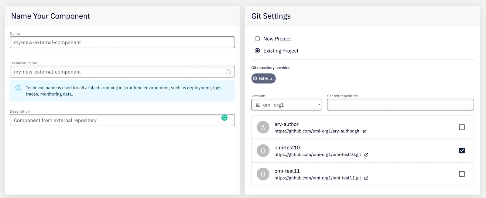 CodeNOW provides a new option for creating application components, and it is possible to use an external repository in your GitHub account. Now you can link your existing source code repository to the application component inside CodeNOW and maintain the life cycle for this code inside CodeNOW.