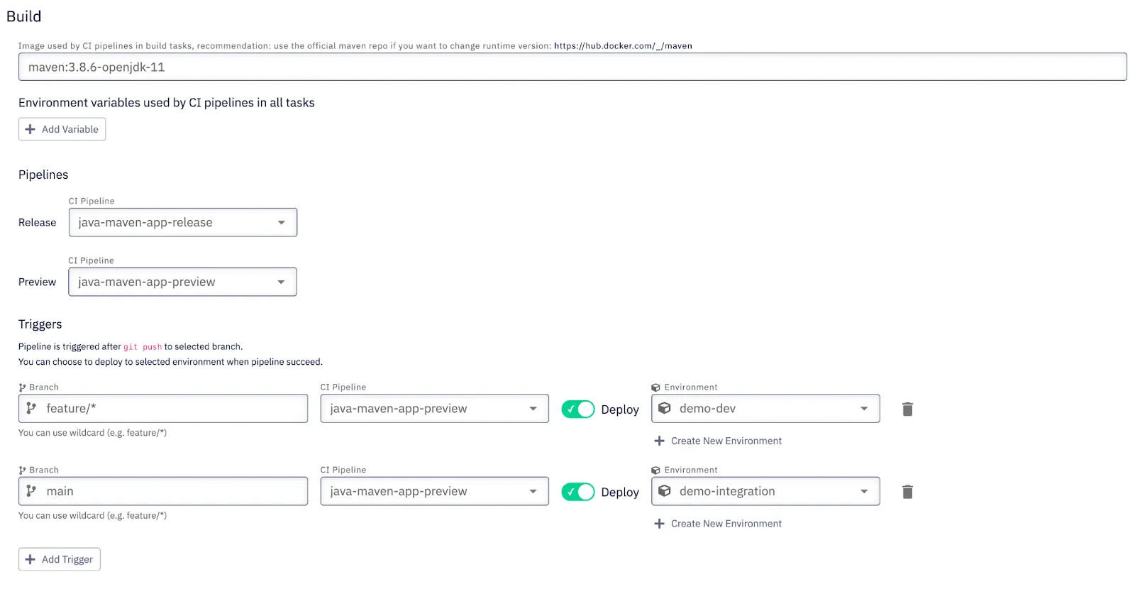 The new version of CodeNOW brings a new capability for settings of triggers CI pipelines. You can easily set up a trigger on push events to your source code repositories and let CodeNOW automatically trigger your build pipeline and optionally deploy the result of the pipeline to any of your environments.
