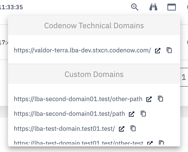 Preview URLs displayed in deployment details now include custom domains connected to the deployment, providing immediate access to applications through their production-ready domain names alongside the existing CodeNOW technical domains.