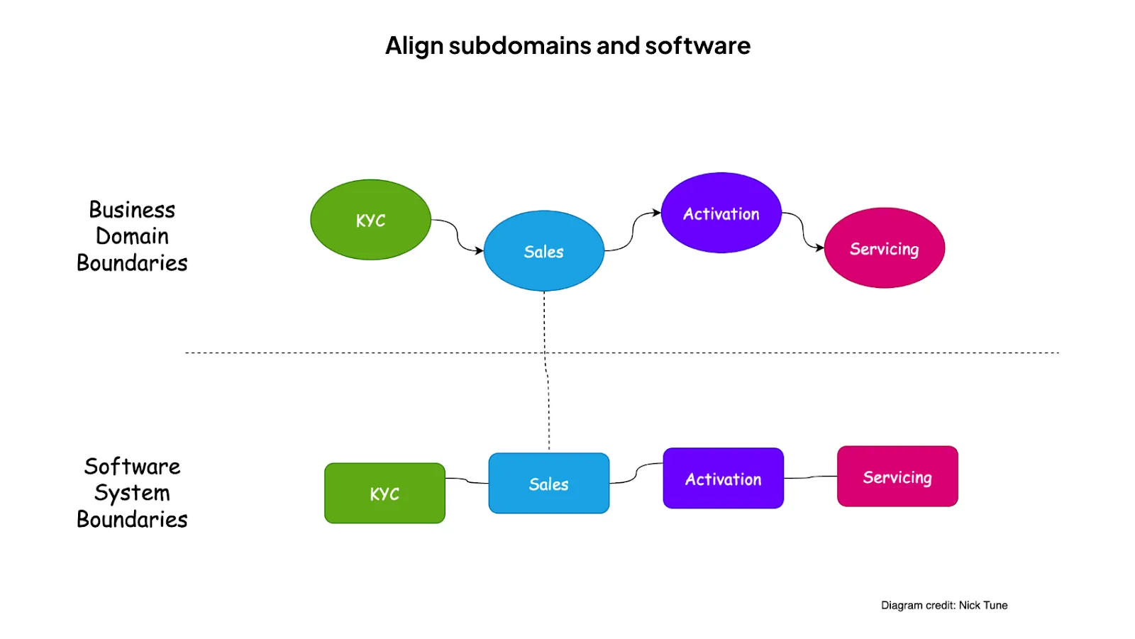 From a broader perspective, you structure a company based on several business domains. Everything in a business may seem perfectly aligned. However, the reality in software is often different. A CRM system stores customer data, and KYC (know your customer) data is also kept there. This leads to integration problems when selling products and pulling data from multiple systems.